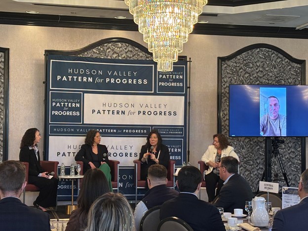 Hudson Valley Pattern for Progress assembled county leaders from the four mid-Hudson counties to discuss a host of pressing issues including SEQRA reform, the housing affordability crisis, inflation and high taxes and economic development. The panel included Dutchess County Executive Sue Serino, Ulster County Executive Jen Metzger, Orange County Executive Steve Neuhaus (via video feed) and Sullivan County Legislative Chairperson Nadia Rajsz. The breakfast forum, moderated by Hudson Valley Pattern for Progress Chairperson Mary Beth Bianconi, was held at the DoubleTree Poughkeepsie on April 8.
